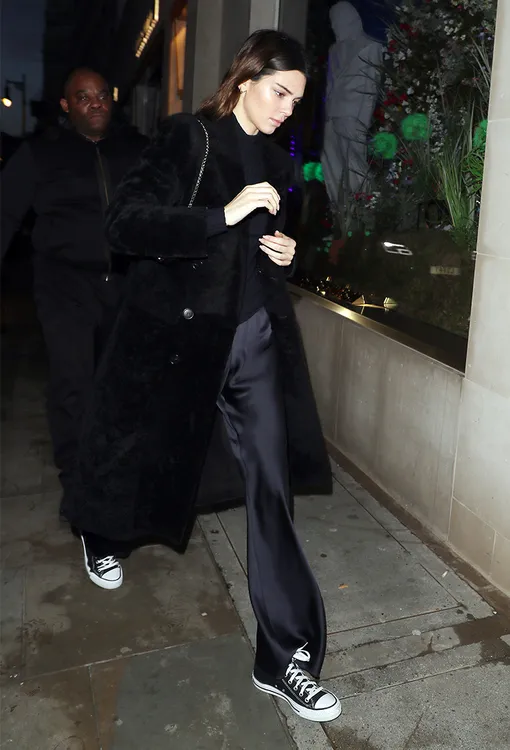 Только Кендалл Дженнер может позволить себе сочетать пижамные атласные брюки и «конверсы»