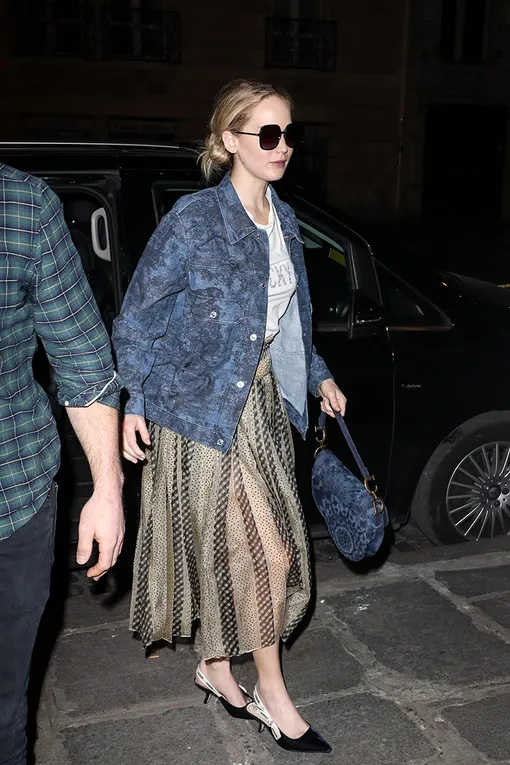 Вечером 27 февраля папарацци подловили звезду на улицах Парижа в многослойном образе: на ней была летящая юбка в пол, простая белая футболка с серой надписью, джинсовка будто с мужского плеча и изящные черные туфли Dior с открытой пяткой. Звезда спешила обратно в свой отель после насыщенного дня и явно не хотела попадаться на глаза фотографам: ее лицо скрывали крупные солнцезащитные очки. Но сложно остаться неузнанной, когда ты — Дженнифер Лоуренс!