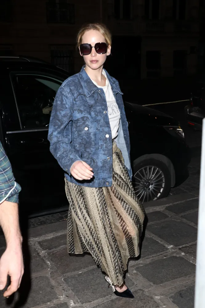 Вечером 27 февраля папарацци подловили звезду на улицах Парижа в многослойном образе: на ней была летящая юбка в пол, простая белая футболка с серой надписью, джинсовка будто с мужского плеча и изящные черные туфли Dior с открытой пяткой. Звезда спешила обратно в свой отель после насыщенного дня и явно не хотела попадаться на глаза фотографам: ее лицо скрывали крупные солнцезащитные очки. Но сложно остаться неузнанной, когда ты — Дженнифер Лоуренс!