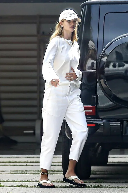 Папарацци сразу же узнали Роузи. На этот раз она надела свободные белые укороченные брюки и белоснежный топ с нарочито длинными рукавами. Образ модель дополнила бейсболкой в тон и белыми вьетнамками на черной подошве. Из аксессуаров наша героиня выбрала только массивную золотую цепочку — одно из своих любимых украшений, которое идеально дополняет образ в любом стиле.
