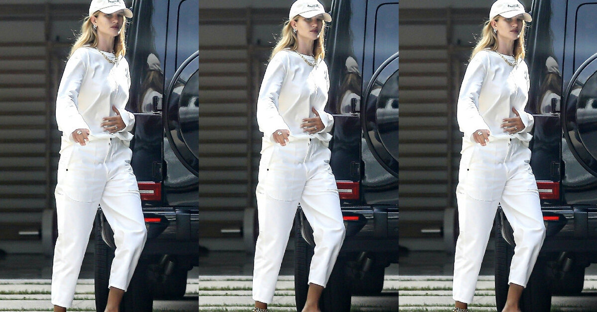 Папарацци сразу же узнали Роузи. На этот раз она надела свободные белые укороченные брюки и белоснежный топ с нарочито длинными рукавами. Образ модель дополнила бейсболкой в тон и белыми вьетнамками на черной подошве. Из аксессуаров наша героиня выбрала только массивную золотую цепочку — одно из своих любимых украшений, которое идеально дополняет образ в любом стиле.