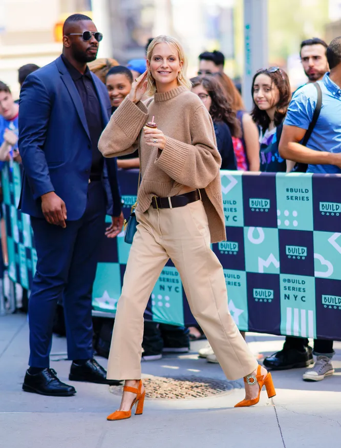 Поппи Делевинь любима публикой ничуть не меньше, чем ее сестра Кара. Обе девушки обладают не только необычной внешностью, но и врожденным чувством стиля. Так, нам особенно понравился последний образ Поппи. Песочного цвета свитер, светлые бежевые брюки и яркие аксессуары — оранжевые туфли и голубая сумка. Получилось очень по-весеннему и совсем нескучно.