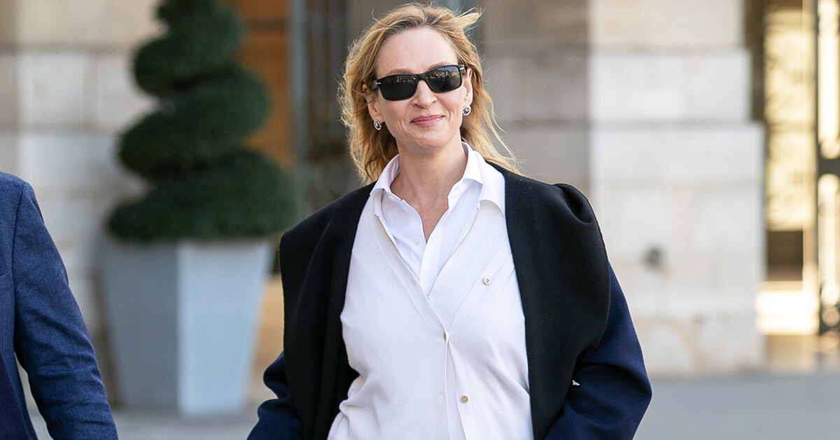Париж всех немного превращает во француженок: Ума Турман сейчас гостит в этом самом романтичном городе на планете и уже явно попала под его чары. Конечно, актриса не щеголяет на его улицах в боди и мерцающих колготках, как Ким Кардашьян, но зато при помощи всего одной детали сумела добавить изюминку в свой повседневный образ. Вчера 48-летняя Турман покинула свой отель в расслабленном кэжуал-аутфите: прямых укороченных джинсах с потертостями, белой блузке, светлом кардигане и черно-синем пальто-халате. Но соль не зря кроется в деталях, и для нашей героини ярким акцентом стала обувь — лодочки с леопардовым принтом на каблуке-рюмочке, самом актуальном в этом сезоне. Отличный выбор, Ума!