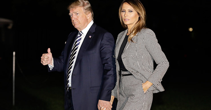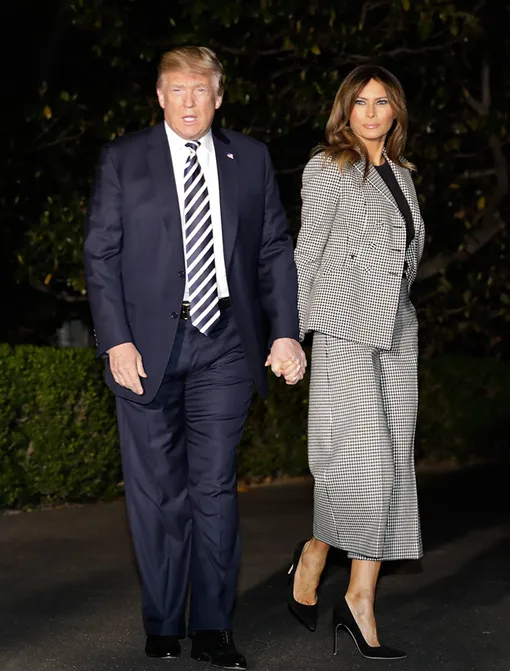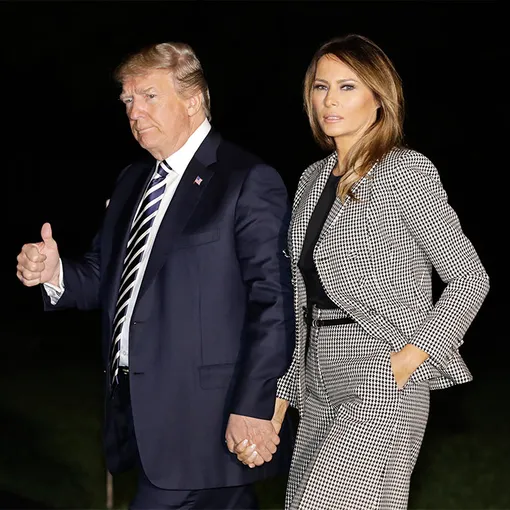 Вчера Дональд и Мелания Трамп прямиком из Белого дома отправились на авиабазу Эндрюс, чтобы встретиться с освобожденными из Северной Кореи американцами. Для поездки первая леди США выбрала серый в мелкую клетку костюм. Приталенный пиджак подчеркивал отличную фигуру Мелании, а широкие брюки-кюлоты не дали в принципе прозаичному комплекту выглядеть скучно.
