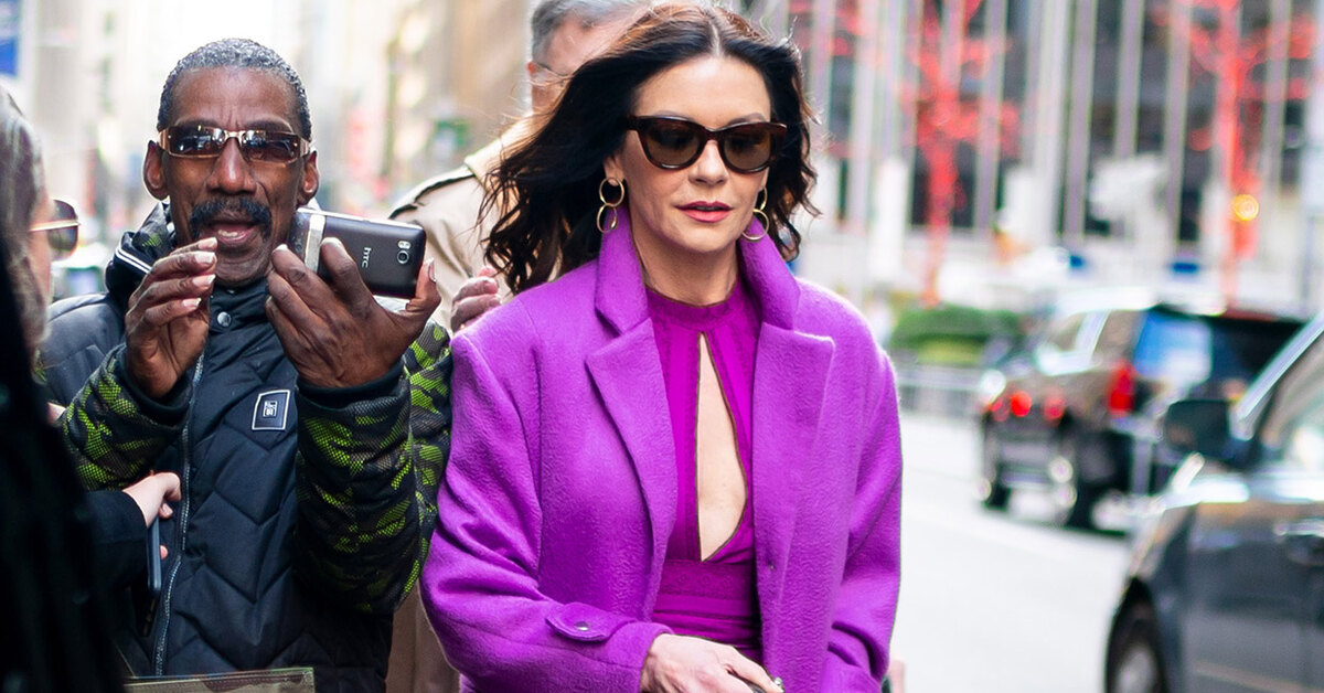 Не только Виктория Бекхэм своими образами покоряет Нью-Йорк: в последнее время нас буквально избаловала Кэтрин Зета-Джонс, которая несколько дней подряд попадает в хроники папарацци. Сейчас актриса участвует в промоакциях телевизионного сериала Queen America, в котором ей досталась главная роль, и вчера она посетила одну из радиостанций холдинга SiriusXM. 49-летняя Кэтрин произвела фурор своим смелым образом: актриса выбрала пурпурное платье Prabal Gurung с глубоким декольте и высоким разрезом, через который были видны ее стройные ноги в нюдовых лодочках, а сверху накинула пальто насыщенного сиреневого оттенка. И кто скажет, что в следующем году Зете-Джонс исполнится 50?