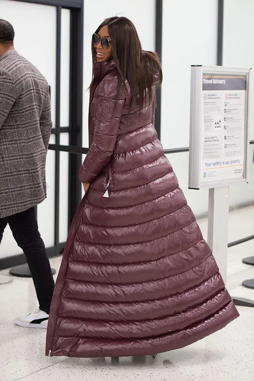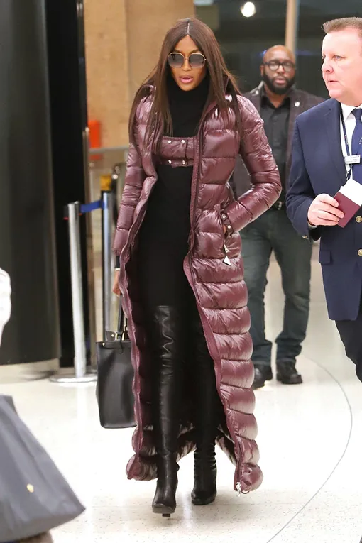 В аэропорт — как на красную дорожку: Наоми Кэмпбелл в платье-пуховике Moncler с лифом и шлейфом