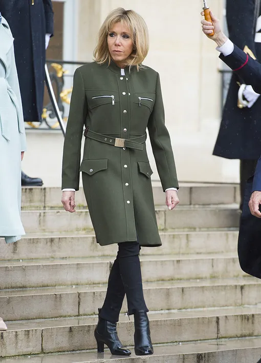 В качестве источника вдохновения для дождливой погоды можно выбрать образ Брижит Макрон, которая вместе с супругом приняла во французской столице лидеров трех балтийских стран: Латвии, Литвы и Эстонии. Для встречи с президентами первая леди Франции сменила мини на оливковое пальто строгого силуэта — конечно, от любимого бренда Louis Vuitton — и добавила к нему укороченные скинни и ботильоны с лакированным мысом. Элегантно, тепло и, главное, нескучно.