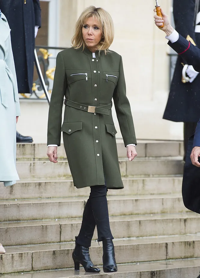 В качестве источника вдохновения для дождливой погоды можно выбрать образ Брижит Макрон, которая вместе с супругом приняла во французской столице лидеров трех балтийских стран: Латвии, Литвы и Эстонии. Для встречи с президентами первая леди Франции сменила мини на оливковое пальто строгого силуэта — конечно, от любимого бренда Louis Vuitton — и добавила к нему укороченные скинни и ботильоны с лакированным мысом. Элегантно, тепло и, главное, нескучно.