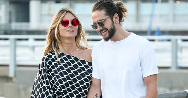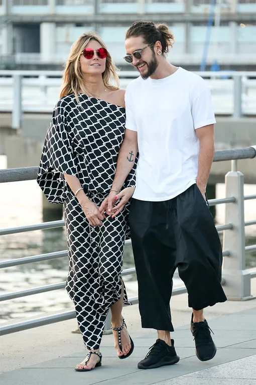 О романе 44-летней Хайди Клум и 28-летнего музыканта из группы Tokio Hotel стало известно в начале марта. С тех пор они постоянно попадают в объективы фотографов абсолютно влюбленными. Очевидно, что разница в возрасте их совершенно не смущает: Том младше немецкой супермодели на 16 лет. Очередное тому доказательство – их последняя совместная прогулка по Большому яблоку. Парочка держалась за руки, периодически останавливаясь, чтобы обменяться объятиями и поцелуями. Супермодель выбрала стильный и комфортный комплект: длинная юбка и топ с открытыми плечами с геометрическим принтом.