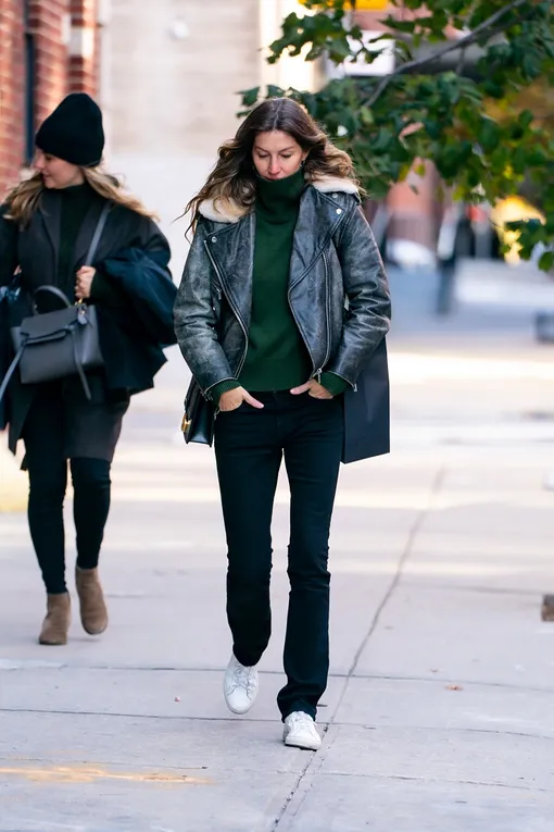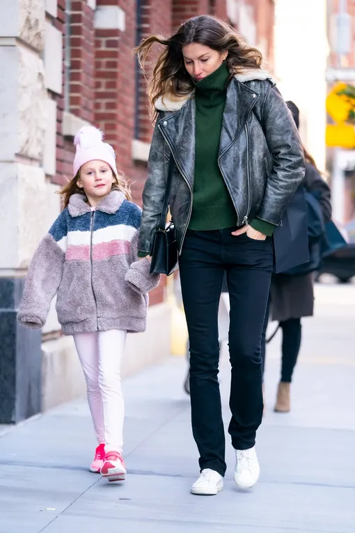 Как любая ответственная мама в будни по утрам, Жизель Бундхен сама провожает дочь в школу и на образовательные кружки. Супермодель запечатлели папарацци в тот трогательный момент, когда они вместе с малышкой Вивьен Лейк Брэди спешили на урок в районе Трайбека в Нью-Йорке. Жизель любит одеваться просто, но всегда уделяет внимание деталям. Например, ее джинсы — не вышедшие из моды скинни, а слегка расклешенные от колена. Вместо классической косухи она выбрала куртку с воротником из овчины: как раз такая на пике популярности в этом сезоне. Кашемировый свитер с высоким горлом (который заменяет Жизель шарф) дополнил этот идеальный образ на каждый день.