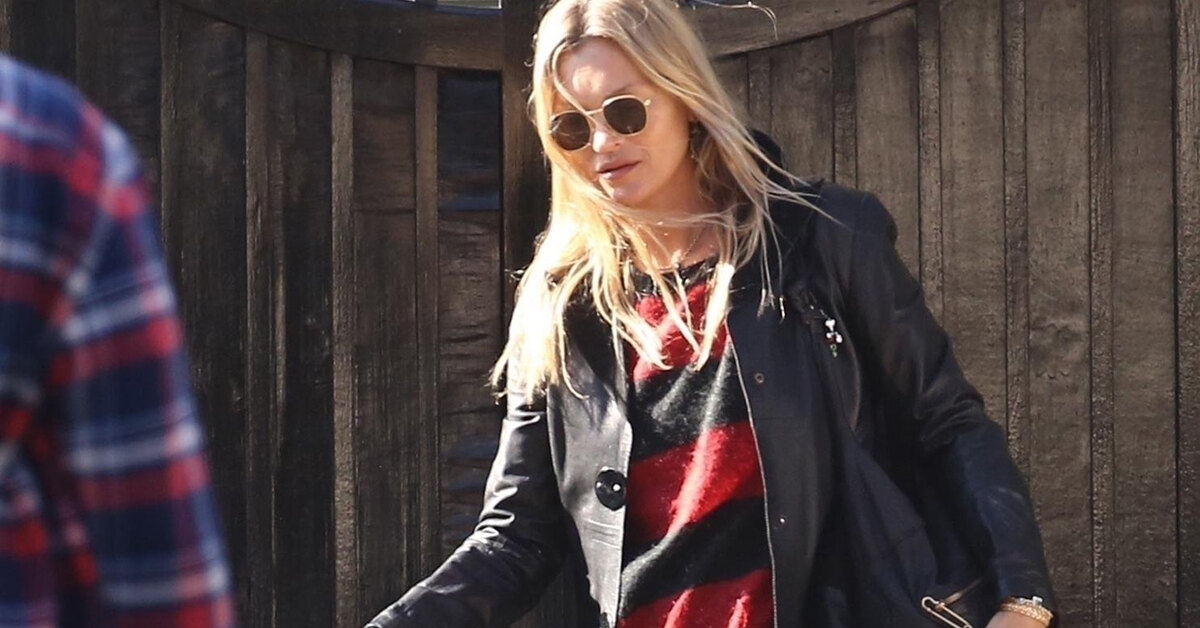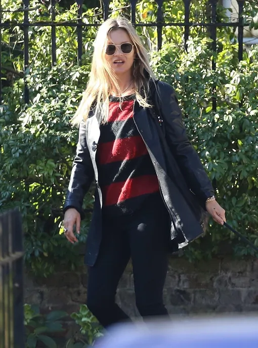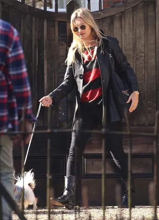 Воскресный день Кейт Мосс провела в компании своего бойфренда и любимой собаки. Топ-модель отправилась на прогулку по солнечному Лондону, надев любимые черные скинни. Их знаменитость дополнила свободным свитером в алую горизонтальную полоску, казаками на невысоком каблуке и кожаным прямым плащом длиной чуть ниже бедер. Прекрасный образ для активных выходных и будней — немаркий, теплый и при этом стильный. То, что нужно для марта!
