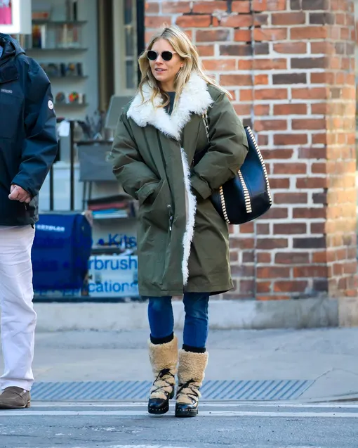 В снежном январе носим сапоги из овчины с меховой паркой, как Сиенна Миллер