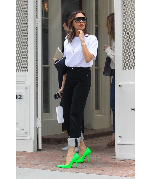 Несмотря на любовь к минимализму и монохромным образам, Виктория Бекхэм явно неравнодушна к ярким оттенкам. Мы не раз видели дизайнера в алом тотал-луке, а недавно в ее коллекцию акцентных вещей добавились лодочки неоново-салатового оттенка. Вики приглянулась модель от Balenciaga, и мы уже любовались на Бекхэм в этих туфлях в конце мая, хотя обычно фэшиониста выходит в свет в обуви из собственных коллекций. Сложную трендовую пару Виктория мастерски вписала в повседневный образ, приглушив яркий оттенок классической белой футболкой, черными джинсами с подворотами и лаконичными солнцезащитными очками Celine.