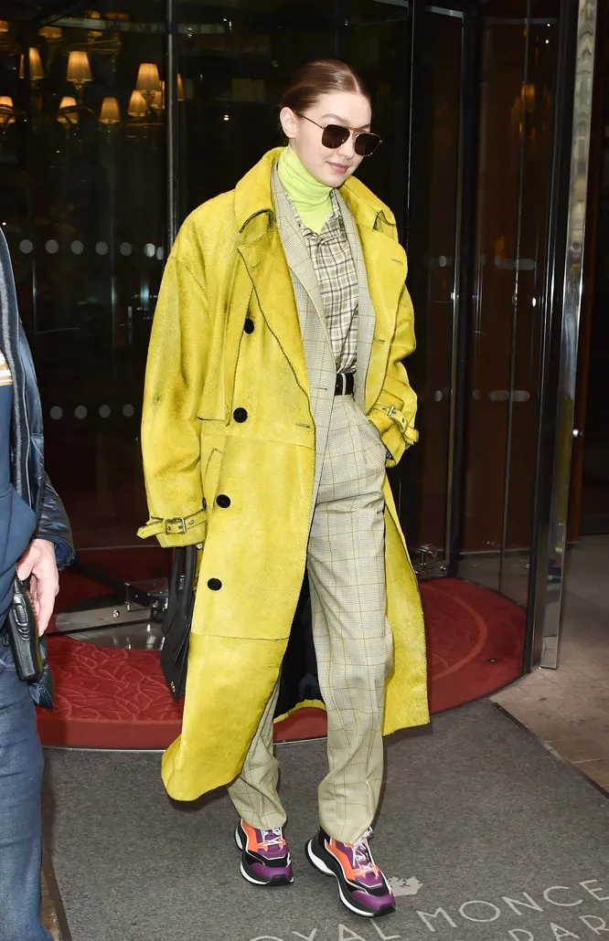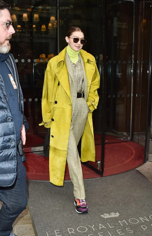 Модель сделала ставку на цвет. Лаймовый тренч она дополнила брючным костюмом с блейзером в полоску в оттенках коричневого. Звезда подиумов надела объемную рубашку в тон костюму, а под нее — водолазку салатового оттенка. Финальным аккордом французского образа Джиджи стали яркие кроссовки в фиолетовых тонах. Лаконичный пучок, никакого макияжа и массивные солнцезащитные очки — стритстайл модели оказался безупречен.