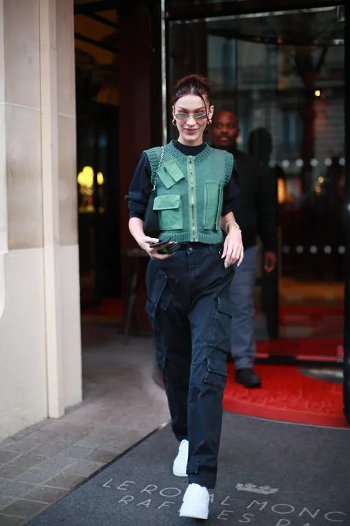 Белла Хадид обожает утилитарный стиль и необычные детали гардероба. Этот сезон для нее особенно прекрасен, потому что в нем доминируют брюки карго, нейтральная палитра, скульптурные силуэты и нестандартные решения. Образ, в котором модель появилась на улицах Парижа, отвечает всем этим модным аспектам. Она составила лук из черной толстовки и брюк карго в тон в комплекте с вязаным жилетом на молнии зеленого цвета в стиле милитари. Темные цвета и объемность Белла компенсировала белыми кроссовками. Несмотря на наличие большого количества карманов, как истинная модница Хадид не обошлась без миниатюрной сумки на цепочке.