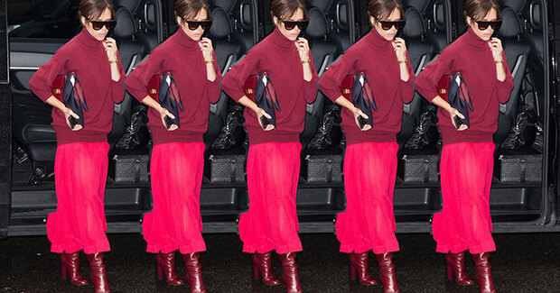 Если каких-то пару-тройку лет назад Виктория Бекхэм буквально «жила» в идеально скроенных брючных костюмах, то сегодня ее повседневная униформа — мешковатый свитер с воротом под горло, юбка миди до середины щиколотки и сапоги с прямым голенищем, край которого неизменно накрывает подол. Этот стандартный набор дизайнер не устает эксплуатировать изо дня в день, варьируя во всевозможных цветовых комбинациях. На этот раз - сочетает марсалу с вишней. Чтобы альтернативы не заканчивались, Вики не забывает включать по несколько дополнительных моделей каждой из трех любимых вещей во все свои коллекции. Всегда — в новых цветах.