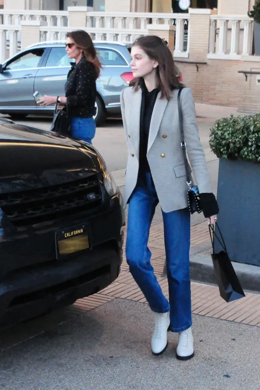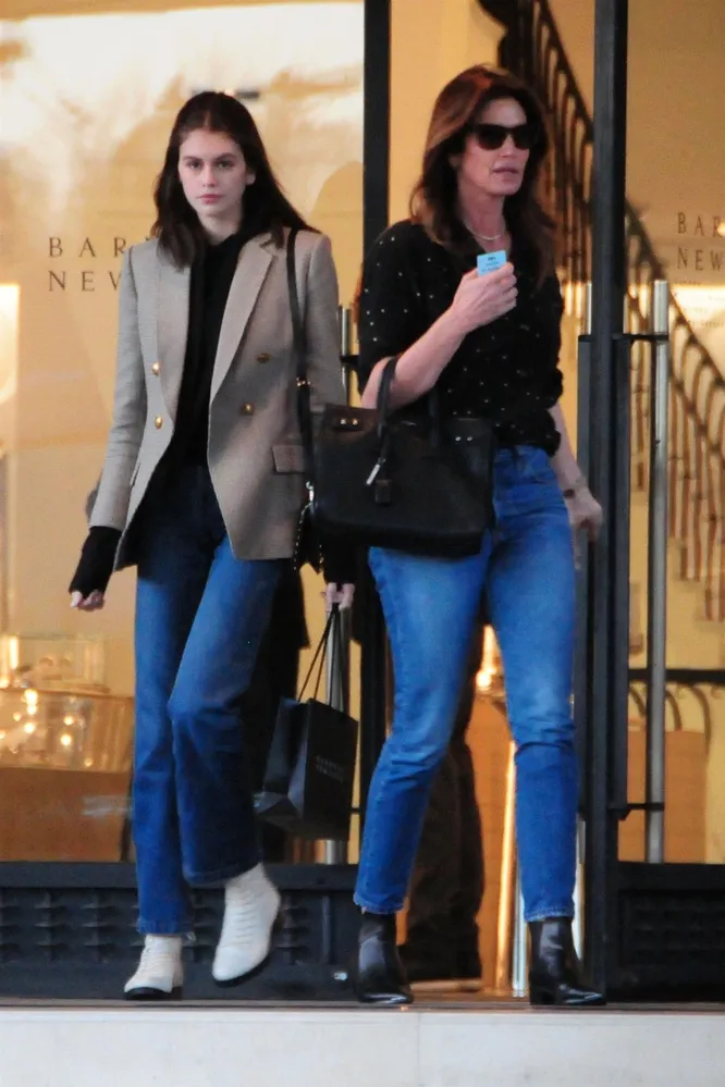 52-летняя супермодель Синди Кроуфорд воспитывает достойную замену — 19-летняя Кайя Гербер не уступает звездной матери в успешной модельной карьере. Кайя берет пример со своей ролевой модели и в выборе одежды - папарацци застали их во время совместного шопинга в Беверли-Хиллз в похожих образах. Синди надела черный топ и синие джинсы скинни, дополнив образ черными ботинками, а ее дочь надела пиджак поверх черного худи, отдав предпочтение белой обуви.