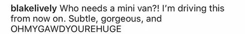 9 сентября, в день 6-летия их с Лайвли брака, Рейнольдс опубликовал снимок грузовика со своим фото на кузове (дело в том, что актер является лицом популярной в США марки джина). Этот кадр он подписал так: «Оказывается, у водителя действительно нет наличных. Зато у него есть перцовый баллончик... и много хорошего джина». Супруга звезды «Дэдпула» не упустила возможности подшутить над благоверным. Вместо того чтобы строчить любимому трогательные поздравления, Блейк решила пойти иным путем и написала такой комментарий: «Кому нужен мини-фургон?! С настоящего момента я вожу этот автомобиль. Утонченный, шикарный... и, боже, просто ОГРОМНЫЙ!». Несложно понять, что звезда сериала «Сплетница» явно намекает на нескромность своего любимого и подшучивает над его стремлением в лишний раз обратить на себя внимание фанатов. Ответа от Рейнольдса не последовало, но мы не сомневаемся, что он просто предпочел парировать жене лично.