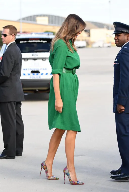 Вчера Мелания Трамп прилетела в Западную Вирджинию, чтобы посетить реабилитационный центр для детей, чьи родители страдают наркотической зависимостью. Для визита первая леди США выбрала зеленое платье-рубашку Cefinn. Отметим, что марку основала супруга бывшего премьер-министра Великобритании Дэвида Кэмерона Саманта. Дополнили образ ремень в цвет платью и яркие лодочки Christian Louboutin.