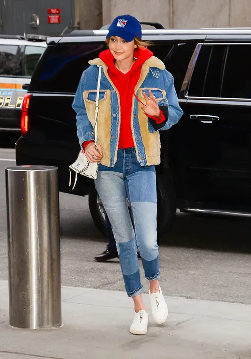 Если Станиславский уверял, что театр начинается с вешалки, то сегодняшний образ Джиджи Хадид явно был придуман под стать бейсболке с символикой любимого хоккейного клуба модели New York Rangers. Сине-красно-белую палитру Джиджи поддержала при помощи джинсов в формате колор-блок, объемного джинсового жакета с меховыми вставками, алого укороченного худи, белоснежных лоферов и сумочки в тон.