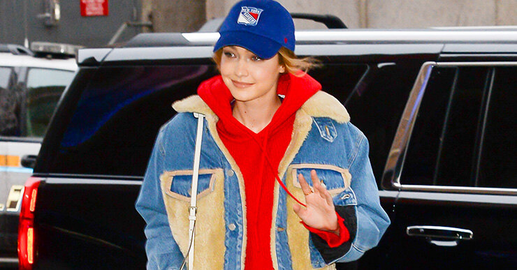 Если Станиславский уверял, что театр начинается с вешалки, то сегодняшний образ Джиджи Хадид явно был придуман под стать бейсболке с символикой любимого хоккейного клуба модели New York Rangers. Сине-красно-белую палитру Джиджи поддержала при помощи джинсов в формате колор-блок, объемного джинсового жакета с меховыми вставками, алого укороченного худи, белоснежных лоферов и сумочки в тон.