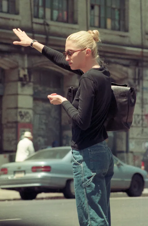 Если вы думаете, что минимализм 90-х это лишь офисные миди-юбки и каблуки T-bar, то взгляните на этот образ Кэролин, главным героем которого стали удобные повседневные белые кроссовки. Ими она дополнила расслабленное комбо из анорака и белых джинсов прямого кроя — идеальный выбор на каждый день.