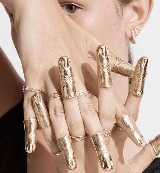 Свое первое кольцо Нино Сепо смастерила из... картона. «Я делала скетчи для коллекции женской одежды и вдруг поняла, что один из рисунков должен превратиться в украшение». Сейчас в ходу у грузинского дизайнера уже материалы попрочнее, а новая коллекция, которая романтично называется All Forgotten Faces, целиком посвящена золотым маскам, превращенным в кольца и серьги. Особенность творческой манеры Нино в том, что она принципиально не использует камни, – говорит, что «для нее это очень странный материал».