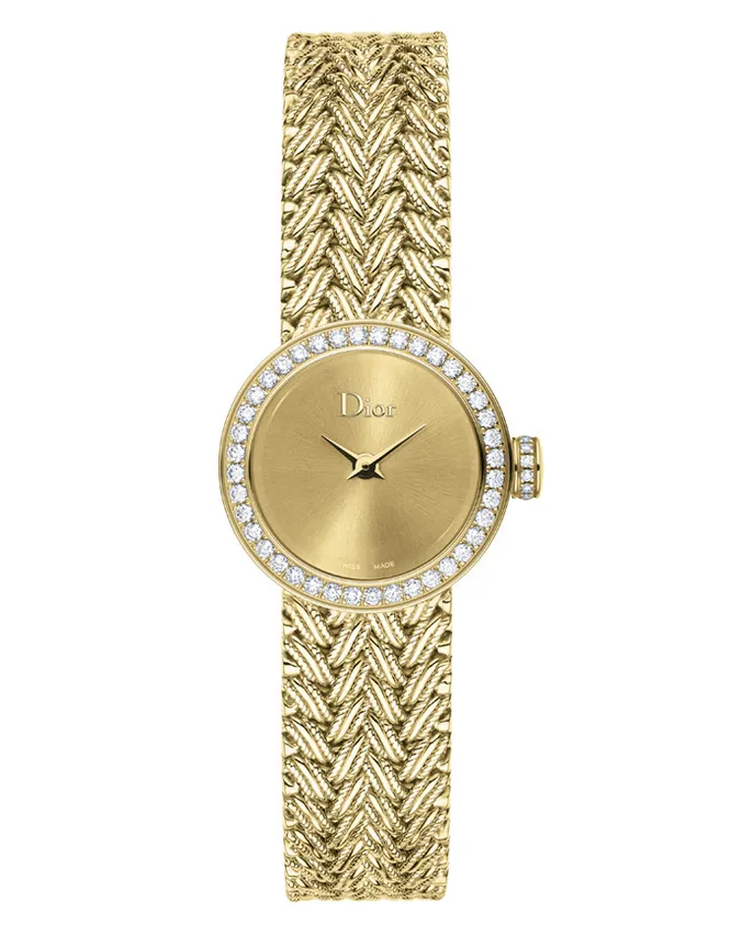 Созданная в честь 70-летнего юбилея Дома модель La Mini D de Dior Satine Tressée в корпусе из желтого золота с безелем и заводной головкой с бриллиантами была дополнена золотым браслетом польского плетения, имитирующим ткань букле. У модели позолоченный матированный циферблат, украшенный гильоше «солнечные лучи», полированные стрелки из желтого золота в стиле «дофин» и раскладывающаяся застежка из желтого золота с бриллиантами. Новинка Dior Horlogerie уже в продаже в бутиках Dior.