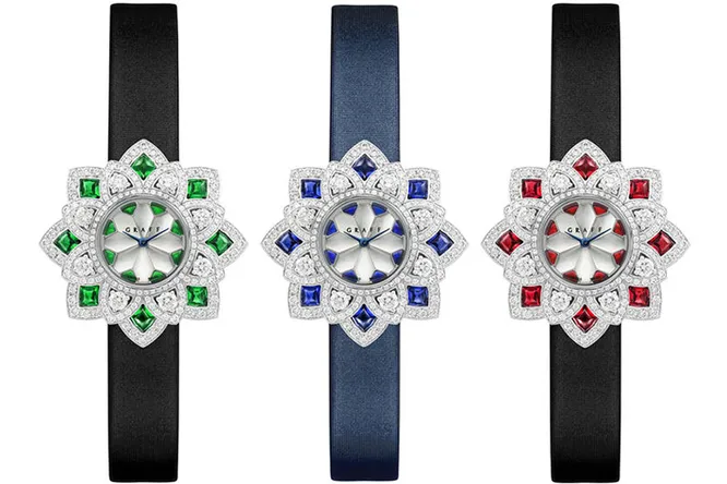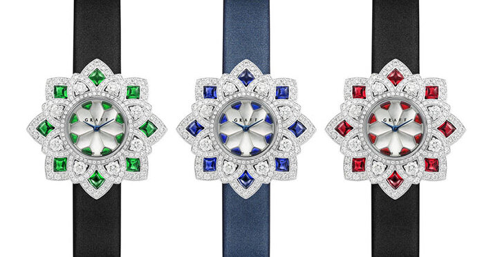 Флористические мотивы часто появляются в коллекциях Дома – исключением не стала и новинка с говорящим названием FloralGraff. Максимально полно передать образ распустившегося цветка призваны лепестки из белого золота, украшенные 120 бриллиантами и 8 сапфирами, изумрудами или рубинами – в зависимости от предпочтений обладательницы. Дополняют по-летнему яркую модель перламутровый циферблат и атласный ремешок.