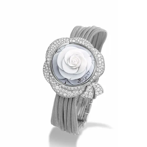 Легендарная французская королева – пожалуй, самая известная поклонница Breguet. Неудивительно, что именно она на протяжении нескольких столетий остается бессменной музой швейцарского Дома. Марии-Антуанетте посвящены сразу несколько коллекций Breguet – в том числе и La Rose de la Reine, на создание которой мастеров Дома вдохновил портрет королевы кисти Элизабет Виже-Лебрен. На картине супруга Людовика XVI изображена с розой в руках – этот цветок и стал главным мотивом коллекции, в которой в 2013-м появились часы Secret de la Reine. И вот год спустя Breguet представляет новую версию модели: главное отличие заключается в том, что место кожаного ремешка занял роскошный золотой браслет, имитирующий плиссированную ленту. Что касается циферблата, то он по-прежнему «спрятан» за камеей с изображением розы и полностью усыпан бриллиантами: нет никаких сомнений, что этот ювелирный шедевр достоин королевы!