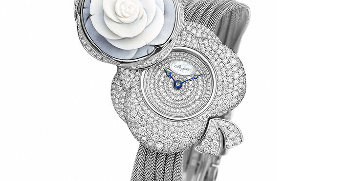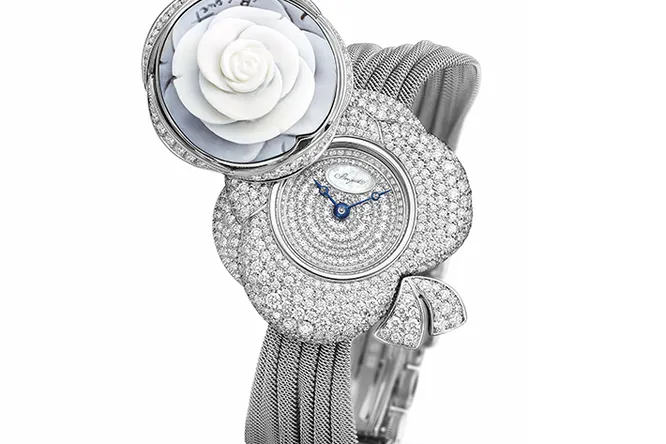Легендарная французская королева – пожалуй, самая известная поклонница Breguet. Неудивительно, что именно она на протяжении нескольких столетий остается бессменной музой швейцарского Дома. Марии-Антуанетте посвящены сразу несколько коллекций Breguet – в том числе и La Rose de la Reine, на создание которой мастеров Дома вдохновил портрет королевы кисти Элизабет Виже-Лебрен. На картине супруга Людовика XVI изображена с розой в руках – этот цветок и стал главным мотивом коллекции, в которой в 2013-м появились часы Secret de la Reine. И вот год спустя Breguet представляет новую версию модели: главное отличие заключается в том, что место кожаного ремешка занял роскошный золотой браслет, имитирующий плиссированную ленту. Что касается циферблата, то он по-прежнему «спрятан» за камеей с изображением розы и полностью усыпан бриллиантами: нет никаких сомнений, что этот ювелирный шедевр достоин королевы!