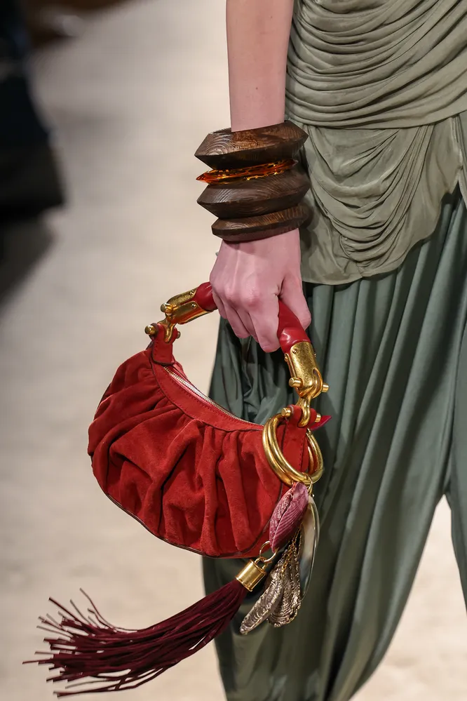 Еще одна популярная тематика заметных браслетов — цепи. Важно упомянуть, что речь идет не про сдержанные вариации из еле заметных звеньев, а довольно массивные модели в максималистском стиле. Такие можно увидеть на показах Saint Laurent и Tory Burch — чтобы гармонично стилизовать их внутри комплекта, можно пойти по двум разным путям. Первый — оставить украшение «солировать». А второй — добавить к нему другие браслеты (например, из эпоксидной смолы или из железа), чтобы довести образ до своего визуального пика. Ниже собрали лучшие варианты стилизаций с показов, которые точно помогут вдохновиться на свои собственные модные эксперименты с крупными браслетами.