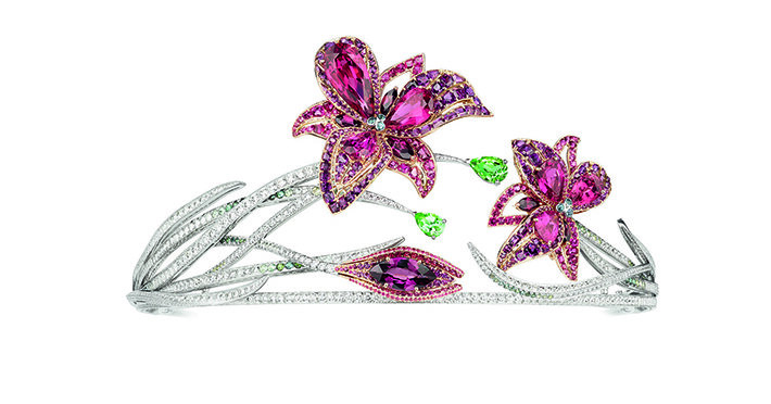Вечнозеленый лавр – знак победы и бога Аполлона, символизирующий бессмертие, – присутствует в трех сетах: Firmament apollinien с листьями из бриллиантов и вкраплениями сапфиров овальной и квадратной огранки, Frise divine, где холодную синюю гамму оттеняют розовые халцедоны и шпинели, и Métamorphoses de Daphné с сочными гроздьями драгоценных минералов. Совсем по-летнему выглядят украшения из коллекции Songe de nuit, вдохновленные цветком лилии: они представляют собой ослепительный контраст самоцветов красного и зеленого оттенков. Листья дуба, несмотря на свой явно маскулинный подтекст (дубовый лист – знамя бога Зевса) удачно обыграны в женственном сете с нежно-розовым жемчугом, фиолетовыми сапфирами и лиловыми шпинелями. Для изображения четвертого образа – пшеницы, символа плодородия и самой жизни – ювелиры выбрали классическое сочетание желтого золота и белых бриллиантов (весом от 1,5 до 10,3 карат) и легкую винтажную стилистику.