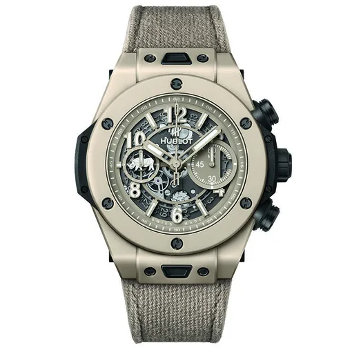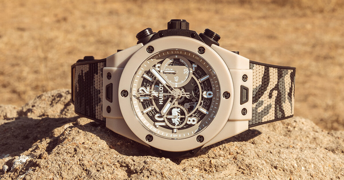Big Bang Unico SORAI – «африканская» интерпретация классических часов Hublot. Керамический корпус размером 45 × 15,45 мм, как и детали циферблата из сапфирового стекла, выполнен в песочном цвете. Ремешок в тон можно заменить на каучуковый камуфляжной расцветки.