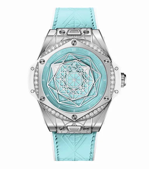 Восьмиугольный безель с бриллиантами обрамляет бирюзовый циферблат. Его геометрический узор, придуманный Максимом, повторяется как на 39-миллиметровом стальном корпусе, так и на ремешке, который, в свою очередь, можно заменить любым другим из коллекции Hublot благодаря технологии One-Click. Новинка продается в кожаной коробке с орнаментом студии Sang Bleu.
