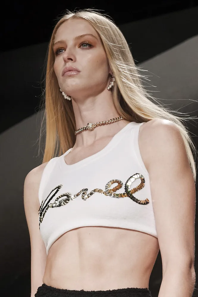 Причем в тренде все вариации чокеров — от тонких цепочек до крупных, широких колье-воротников. Последние, например, появились у Balmain: широкие золотистые ожерелья из крупных звеньев плотно облегали шеи моделей на показе французского Дома. А вот Chanel и Fendi сделали выбор в пользу лаконичных цепочек, дополненных миниатюрными монограммами, как бы напоминая, что логомания — все еще важный ювелирный тренд сезона. А вот Coperni и Isabel Marant пошли по другому, более красочному, пути: первые сделали чокеры из крупных цветных кристаллов, а вторые — из яркого гнутого металла.