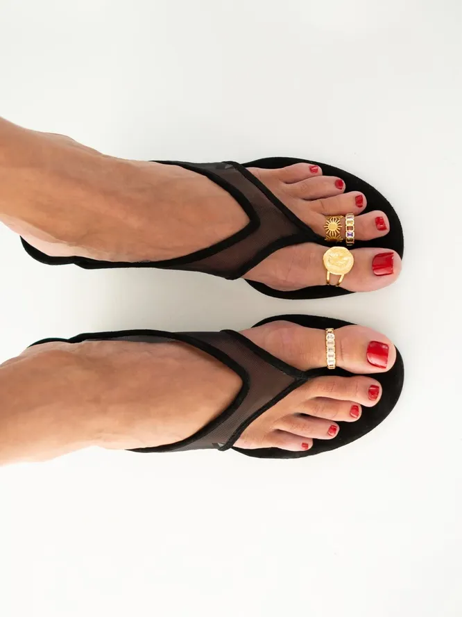 Есть и еще один интересный момент. Рианна, демонстрируя массивный бриллиант на ноге, сопровождает лук ироничной отсылкой к «тихой роскоши» (а на тот момент эта эстетика была на пике популярности). И это точное попадание в настроение уже нашего времени. Роскошь больше не обязана быть очевидной или «правильной». Она может быть игривой, немного провокационной, и точно не скучной. Как использовать этот трюк вам? Берите любое ваше любимое кольцо и примерьте его на любой палец ноги. Можно даже выбрать несколько позиций и составить целый сет. Обувь? Начните со вьетнамок — это действительно самое простое решение. А больше идей для экспериментов вы найдете в галерее ниже.