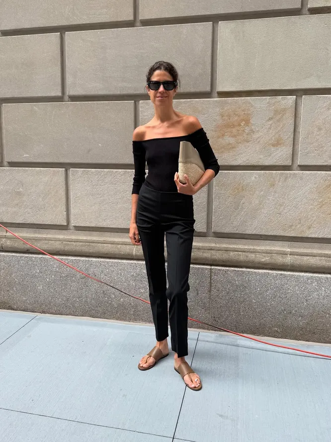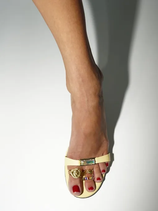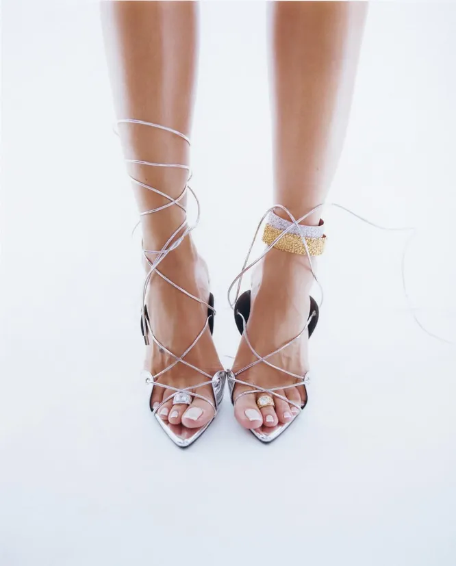 Но ключевой момент наступает тогда, когда к нему подключается еще одна икона стиля — Леандра Медин. Если Рианна задала эффект, то Леандра предложила понятный способ интеграции в повседневность. Она носит одно, будто помолвочное, кольцо с вьетнамками или простыми сандалиями, не перегружая образ. Добавляет его так, будто это самая естественная вещь в гардеробе. И именно этот подход закрепляет тренд: он перестает быть подиумной фантазией и становится частью реальной жизни. Почему это сработало? Во-первых, мы продолжаем переосмыслять нулевые. Только теперь делаем это иначе: берем знакомые символы и выводим их на новый уровень. Во-вторых, внимание смещается. Раньше акцент был в основном на портретную зону, а уже потом все остальное. Сейчас взгляд опускается ниже — к обуви, щиколоткам, пальцам ног. Образ интереснее рассматривать.