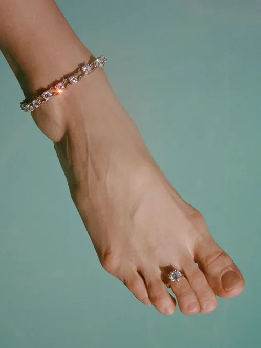 Если говорить серьезно, прием, когда кольца носят на пальцах ног, появился не вчера. Он давно существует в мировой культуре — например, в Индии, — и уже мелькал в моде нулевых. Тогда так носили кольца звезды в духе Бритни Спирс или Ким Кардашьян. Но воспринимались это скорее как курортная деталь — легкая и забавная. Все изменилось в тот момент, когда в игру вступила Рианна. В 2023 году она появляется с бриллиантовым кольцом внушительного размера на пальце ноги. Не деликатный акцент, а полноценное ювелирное высказывание. И в этот момент происходит сдвиг. Кольцо на ноге перестает быть чем-то второстепенным и переходит в категорию сильных стилистических жестов. Тот самый случай, когда всего один звездный выход меняет правила игры. Дальше все развивается стремительно. Тренд подхватывают разные фигуры: от Карлы Бруни до Бэд Банни.