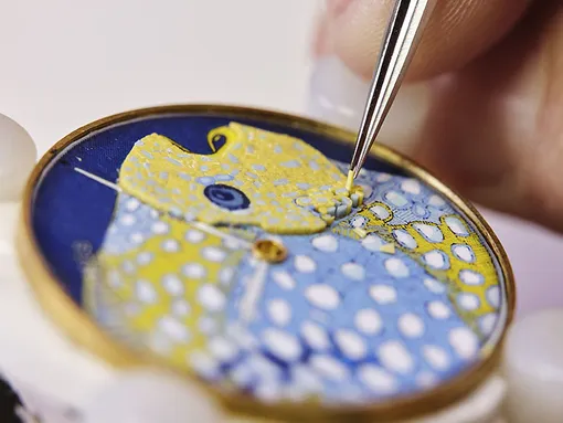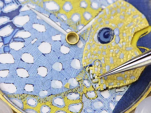 Рыбка на новых часах Hermès Arceau Grands Fonds – деталь узора, созданного художницей Анни Фэвр для платка-каре Grands Fonds («Глубокие воды») в 1992 году. Несмотря на всю тонкость и изящество ее работы, мастера-ювелиры Hermès смогли сделать яркий экзотичный рисунок еще более ценным для Дома и его поклонниц. Рыбка на циферблате выложена в технике микромозаики из стекла: только для одной такой требуется больше месяца работы. А она действительно не из легких: сначала мастер подбирает кусочки стекла различных оттенков, дробит их, затем плавит, вытягивая нити необходимой толщины, и выкладывает, начиная с низа циферблата.