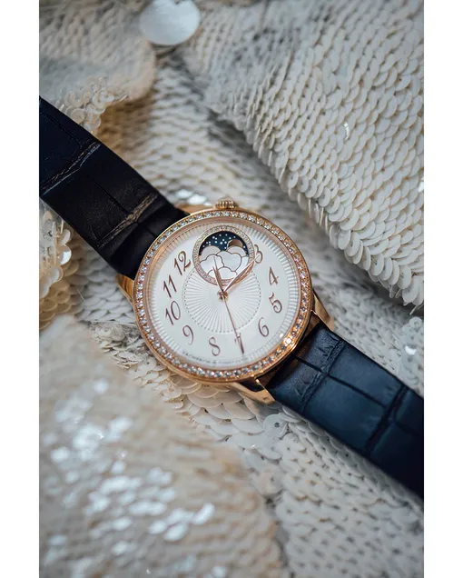 Модели с индикатором фаз Луны выпущены в 37-миллиметровом корпусе и доступны в версиях из розового золота и стали. Индикатор предстает перед нами в поистине поэтичном исполнении: в виде фрагмента звездного неба, заключенного в круг из 36 бриллиантов. Из-за перламутровых облаков выглядывает золотая луна, а матовый серебристый циферблат служит элегантной сценой всему происходящему. Еще одна точка обзора – прозрачная задняя крышка корпуса, сделанная из сапфирового стекла, – демонстрирует отделку во всей красе: мы видим выполненный вручную узор «женевские волны» и скелетонизированный золотой ротор в форме мальтийского креста.