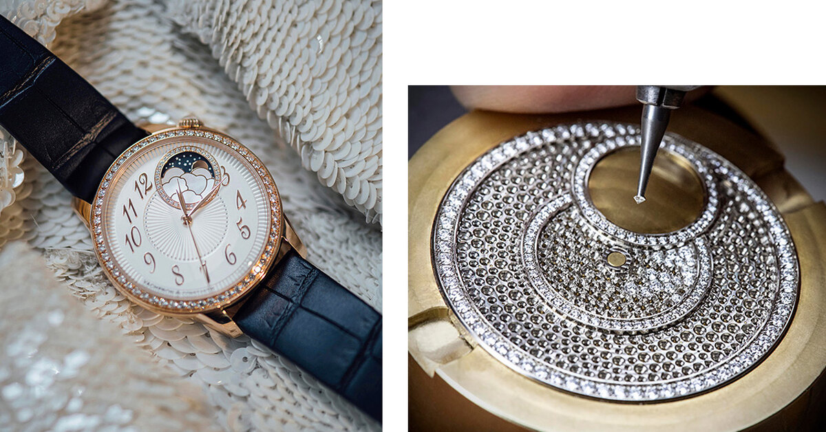Модели с индикатором фаз Луны выпущены в 37-миллиметровом корпусе и доступны в версиях из розового золота и стали. Индикатор предстает перед нами в поистине поэтичном исполнении: в виде фрагмента звездного неба, заключенного в круг из 36 бриллиантов. Из-за перламутровых облаков выглядывает золотая луна, а матовый серебристый циферблат служит элегантной сценой всему происходящему. Еще одна точка обзора – прозрачная задняя крышка корпуса, сделанная из сапфирового стекла, – демонстрирует отделку во всей красе: мы видим выполненный вручную узор «женевские волны» и скелетонизированный золотой ротор в форме мальтийского креста.