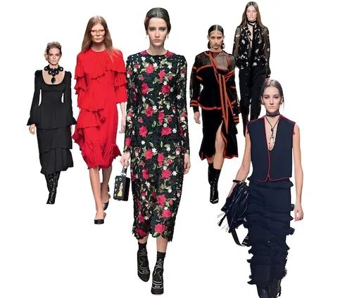 Дизайнеры продолжают сочинять драматичные истории с роковыми героинями в черных или ярко-алых платьях, не забывая о контрастных акцентах и россыпях отнюдь не невинных цветочных принтов.
