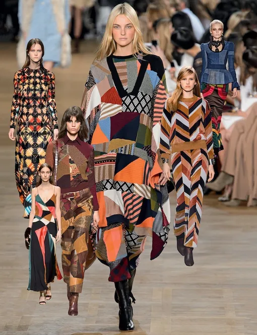 Плавно перейдя из прошлого сезона в новый, этот тренд разбил дизайнеров на два лагеря. Одни с головой ушли в абстракцию, соединяя лоскуты ткани, кожи и замши в хаотичные полотна, другие же объявили себя адептами симметрии. Впрочем, психоделический эффект гарантирован в любом случае.