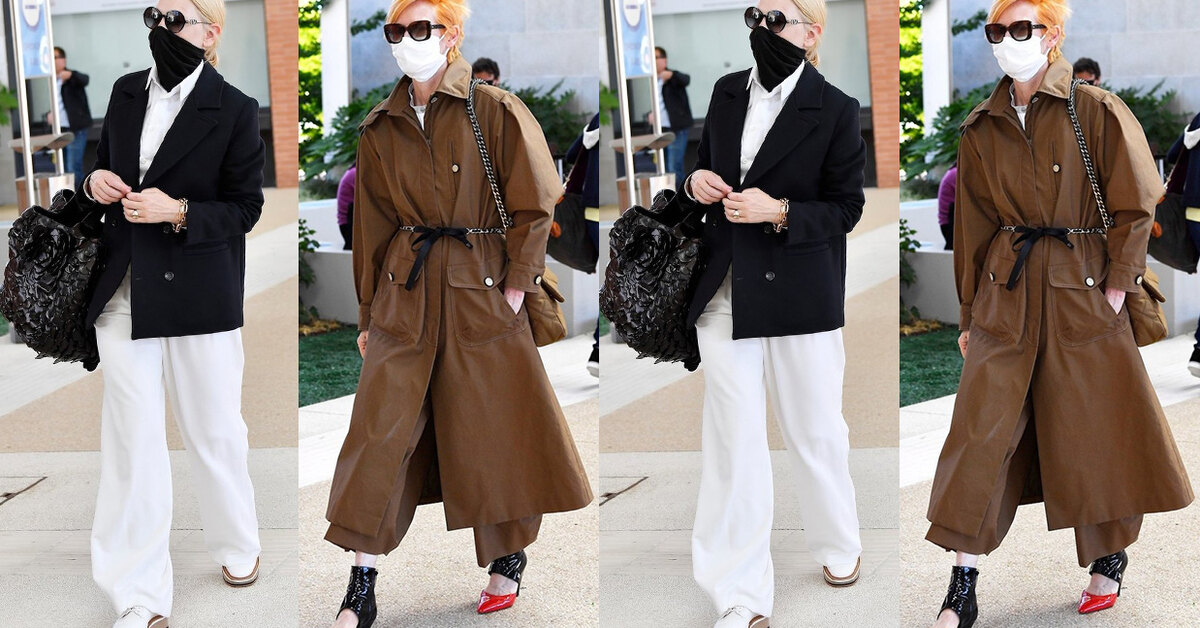 Кейт Бланшетт, которая в этом году является председателем жюри главного конкурса, была замечена папарацци в повседневном классическом образе. На ней были белые широкие брюки, рубашка, надетая поверх водолазки, и синий двубортный пиджак. Завершили образ белые удобные кроссовки, солнцезащитные очки с круглой оправой и сумка из кожи от Valentino Garavani. Кейт Бланшетт в одежде придерживается принципов устойчивого развития — поэтому не ждите увидеть актрису в новых или нестандартных вещах, взятые на время у брендов. Она появится на фестивале лишь в той одежде, что есть у нее в гардеробе.