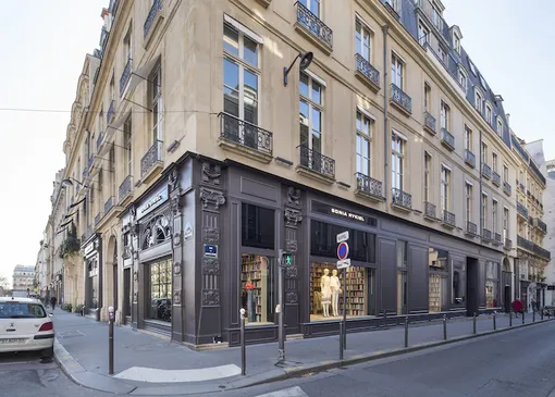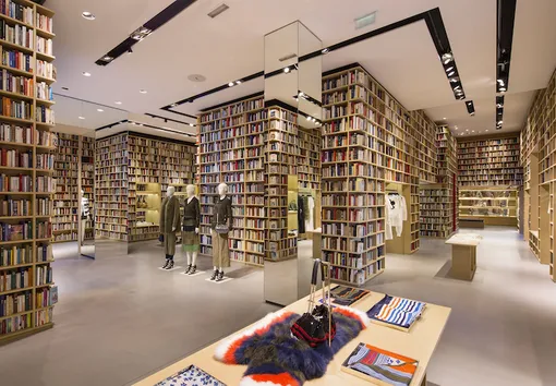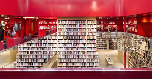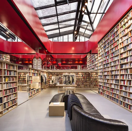 При входе в бутик на левом берегу Сены гостей встречают бессчетные книжные полки, до потолка заставленные разноцветными томами художественных произведений. Поднявшись из библиотечного зала вверх по лестнице, можно попасть в концептуальное пространство сочного алого цвета, своей яркостью поражающее воображение.