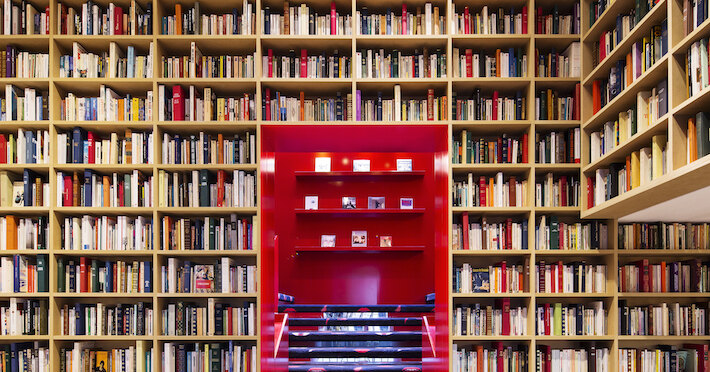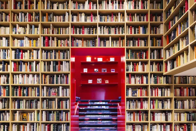 При входе в бутик на левом берегу Сены гостей встречают бессчетные книжные полки, до потолка заставленные разноцветными томами художественных произведений. Поднявшись из библиотечного зала вверх по лестнице, можно попасть в концептуальное пространство сочного алого цвета, своей яркостью поражающее воображение.