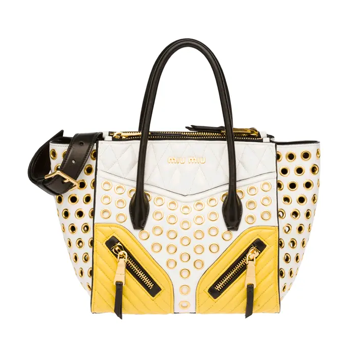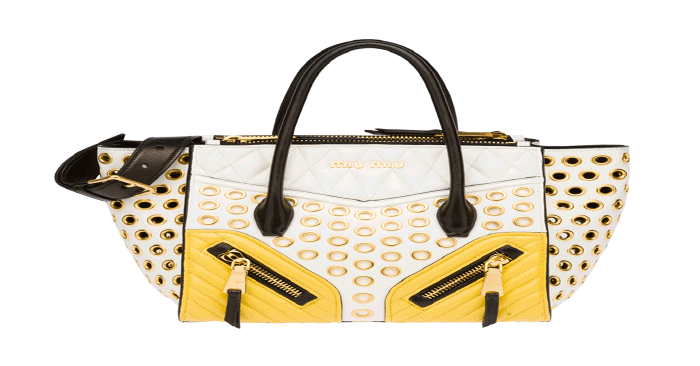 Сумка Biker Bag, впервые представленная в прошлогодней осенне-зимней коллекции Miu Miu, сразу стала настоящей визитной карточкой бренда. «Агрессивная» фурнитура, кожаные вставки и массивные молнии теперь буквально кочуют из сезона в сезон, при этом цвета и формы аксессуара все время меняются. При создании моделей из коллекции осень-зима 2014/15 ставка была сделана на яркие цвета, деним и практичные длинные ремни – с такой сумкой любой наряд, от повседневных джинсов и джемпера до коктейльного платья, будет выглядеть по-рокерски дерзко!