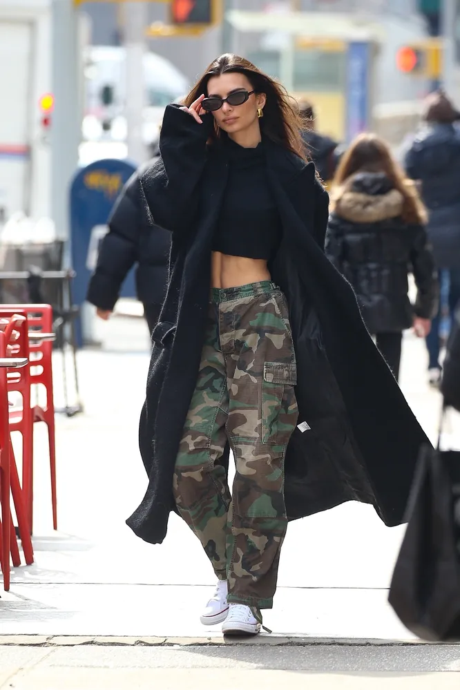 Эмили Ратаковски выбрала джинсы с накладными карманами в камуфляжной расцветке, однако даже с ними она смогла создать вполне женственный образ. Карго на низкой посадке она сочетала с черным кроп-топом, открывающим ее идеальный рельефный пресс. Чтобы не замерзнуть, 30-летняя модель надела черное классическое пальто с широкими лацканами и объемными рукавами. Завершили образ классические белые кеды Converse, узкие солнцезащитные очки и золотые серьги.