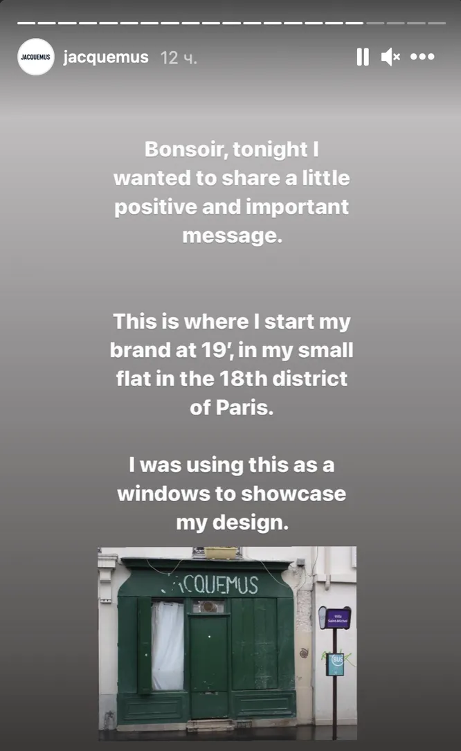 Также в своих Instagram (Социальная сеть признана экстремистской и запрещена на территории Российской Федерации) Stories дизайнер поделился вдохновляющей историей. Он выложил фото первого офиса своей марки, который по совместительству являлся еще и его собственной квартирой. На тот момент дизайнеру было всего 19 лет — он только открыл именной бренд и выпустил первую коллекцию, которую выложил на Facebook (Социальная сеть признана экстремистской и запрещена на территории Российской Федерации). «С тех пор многое изменилось. Так много разных шагов, но всегда — одна мечта. Поделиться этим с вами значит очень много для меня. Все возможно!», — поделился Жакмюс своими эмоциями по поводу таких масштабных перемен в собственной жизни.